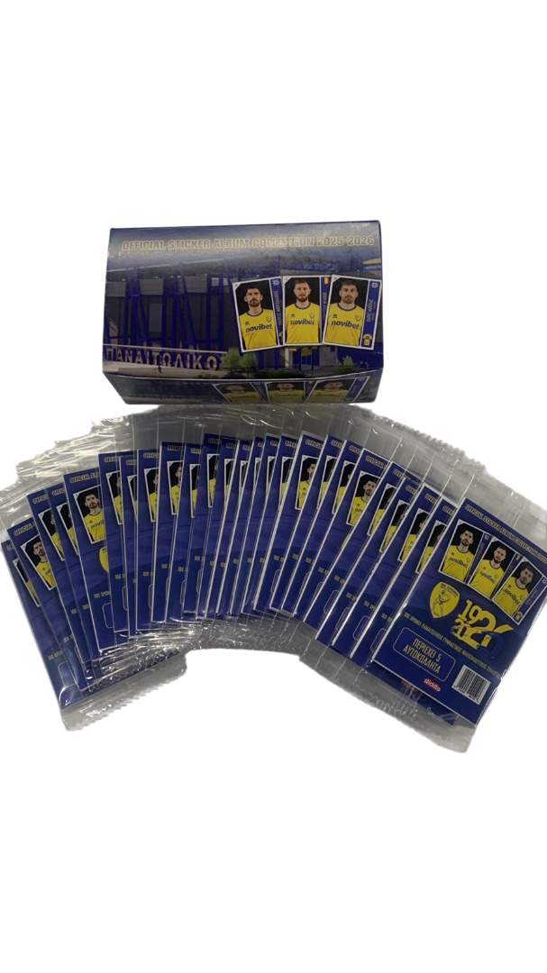 Επίσημο κουτί συλλογής αυτοκόλλητων του Παναιτωλικού για την αγωνιστική περίοδο 2025–2026, για τον εορτασμό της ιστορικής 100ής επετείου του συλλόγου, που περιέχει 25 πακέτα αυτοκόλλητων, με 5 αυτοκόλλητα ανά πακέτο.